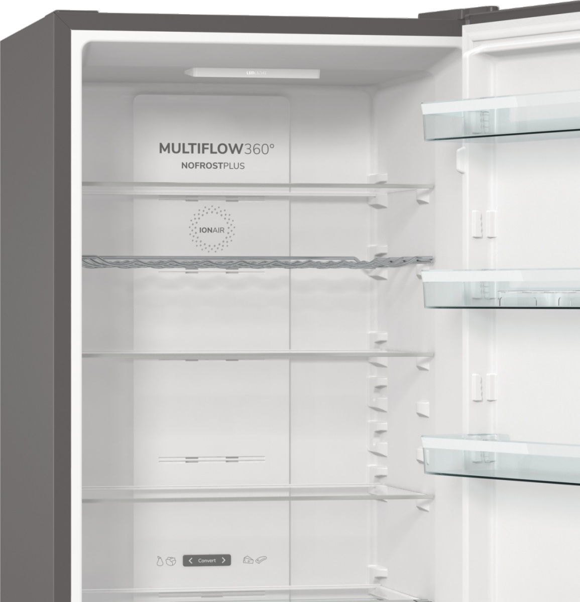 Просторий ящик CrispZone забезпечує збереження свіжості та поживних властивостей продуктів завдяки зниженій температурі. Технологія IonAir створює негативно заряджені іони, які рівномірно розподіляються у холодильній камері за допомогою системи MultiFlow 360°. Повітря, збагачене аніонами, сприяє збереженню природного аромату продуктів та ефективно усуває неприємні запахи.