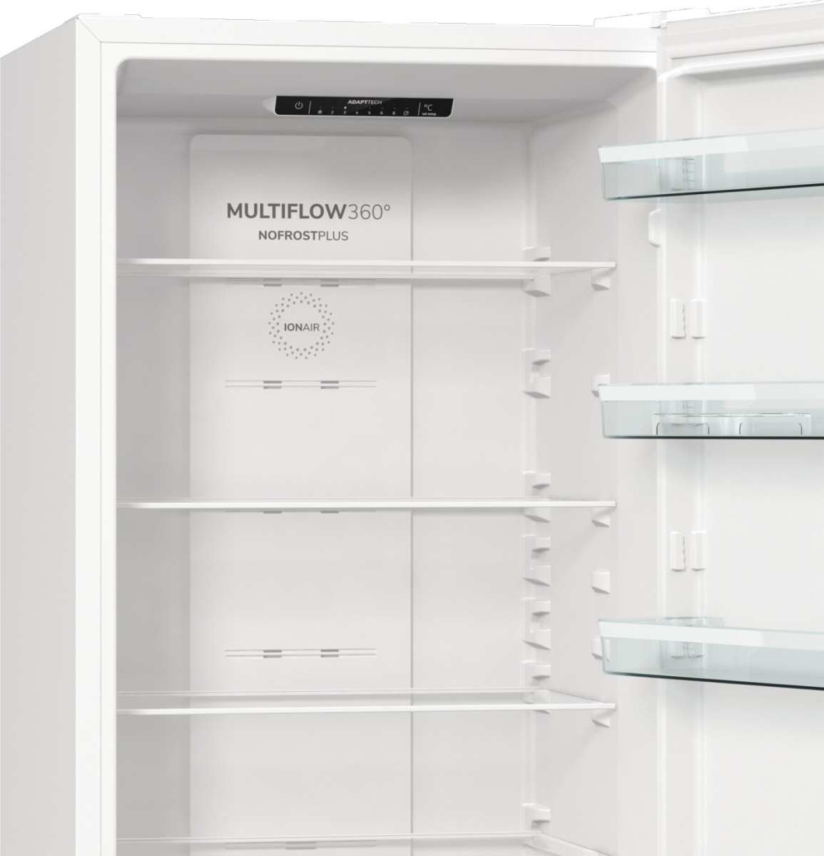 Завдяки технологіям IonAir і MultiFlow 360° продукти зберігають свіжість протягом тривалого часу. Інноваційна система охолодження AdaptTech автоматично регулює температурний режим, підтримуючи оптимальні умови для зберігання їжі. Реалізація No Frost Plus як у холодильній, так і в морозильній камері запобігає утворенню інею та значно спрощує догляд за приладом.