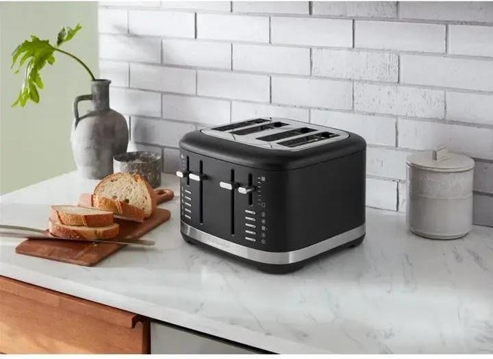 Тостер KitchenAid 5KMT4109EBM на 4 слоти надає широкий вибір відтінків підсмажування тостів, від світлого до темного. У ньому можна підсмажувати хліб, кекси, рогалики тощо, саме так, як найбільше подобається. Дві пари незалежних слотів мають окреме керування для гнучкості в приготуванні улюблених страв на сніданок.