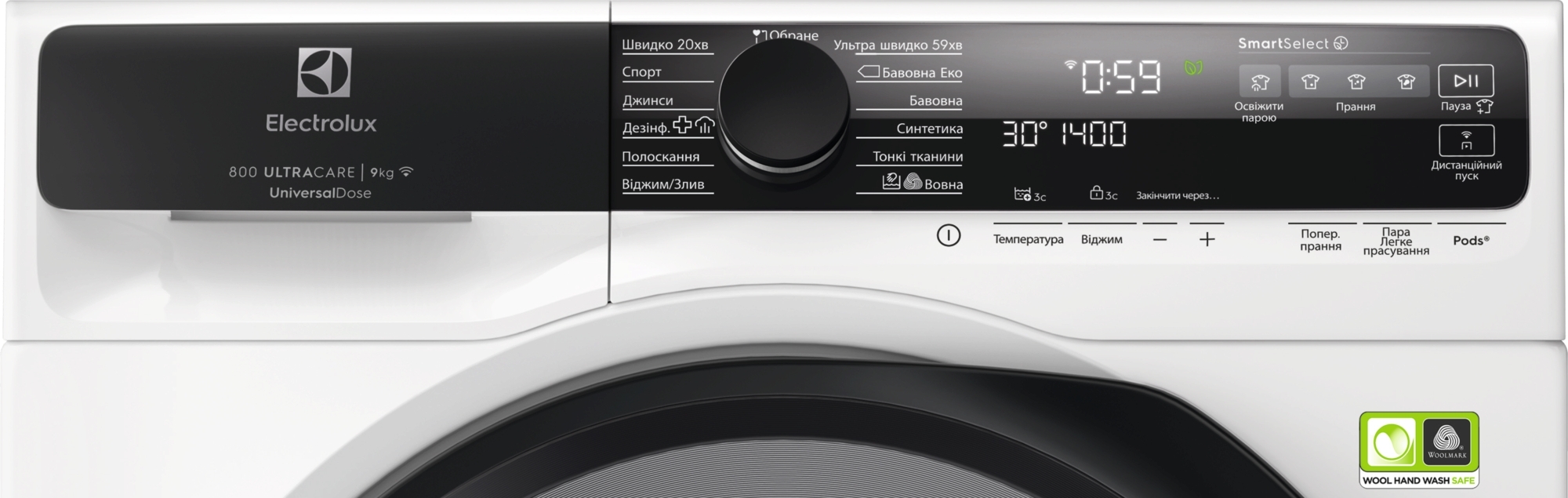 Функція SmartSelect дозволяє налаштовувати інтенсивність прання відповідно до обраного циклу. Залежно від вибраних параметрів система відображає тривалість програми та температуру, сприяючи економії до 80% енергії, 50% часу та 20% води.