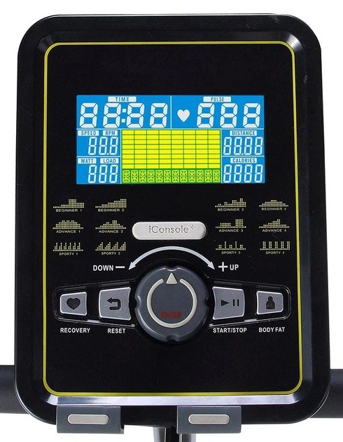 Кольоровий LCD‑комп’ютер відображає всі ключові параметри: пульс, час, дистанцію, швидкість, кількість обертів за хвилину, калорії, потужність (Вт) та рівень навантаження. Передбачено 20 програм, включно з 12 автоматичними, користувацькими режимами, HRC‑контролем серцевого ритму, режимом встановленої потужності, вимірюванням жирової тканини та функцією відновлення Recovery.