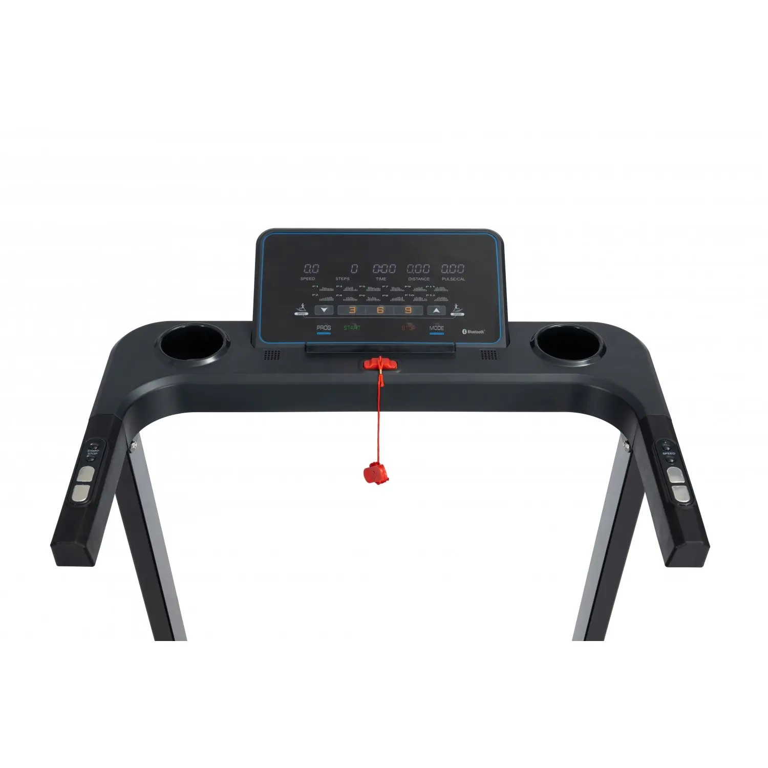 Бігова поверхня розміром 120 × 42 см забезпечує комфорт під час занять, а ключ аварійної зупинки гарантує безпеку. Передбачено 12 вбудованих програм, ручний режим управління та функції зворотного відліку дистанції, часу та калорій. Підставка для планшета або телефону дозволяє поєднувати тренування з переглядом контенту.