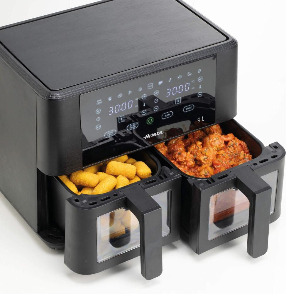 Мультипіч ARIETE 4631 BL. За допомогою подвійної фритюрниці на 9 л ви можете смажити будь-яку страву у великих кількостях, використовуючи лише одну столову ложку олії, щоб отримати здорові та смачні смажені страви. Завдяки 2 кошикам по 4,5 л кожен, з подвійною фритюрницею Ariete 9L ви зможете приготувати до 3,6 кг картоплі фрі за один раз! Картопля фрі, але не тільки вона, а також крокети, риба, м'ясо та багато інших панірованих страв, як заморожених і готових до смаження, так і свіжих і нещодавно панірованих, завдяки 11 попередньо встановленим програмам.