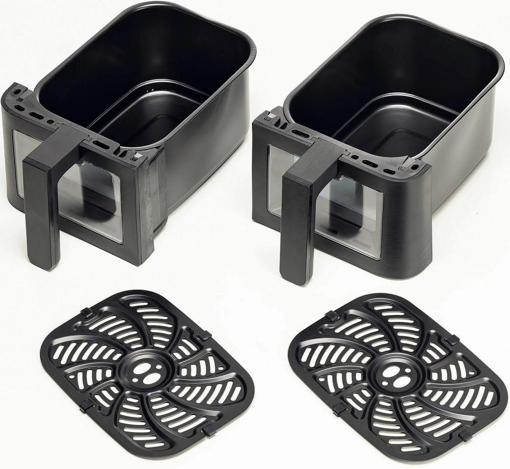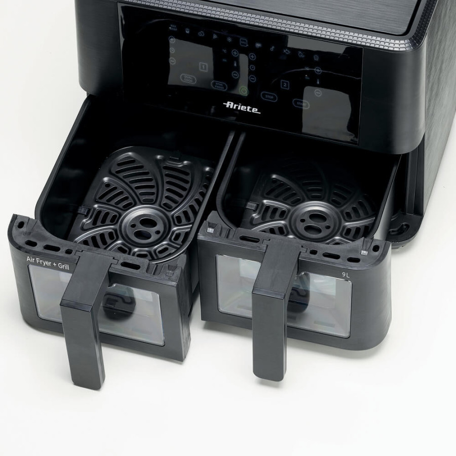 За допомогою великої сенсорної панелі ви можете регулювати час приготування, програми, температуру і таймер окремо для кожного кошика. Подвійна фритюрниця 9L пропонує функцію гриля і Max Crisp для більш хрустких страв, функцію Sync для синхронізації закінчення приготування страв в різний час, функцію Dual Cook для подвоєння кількості та функцію сушіння.