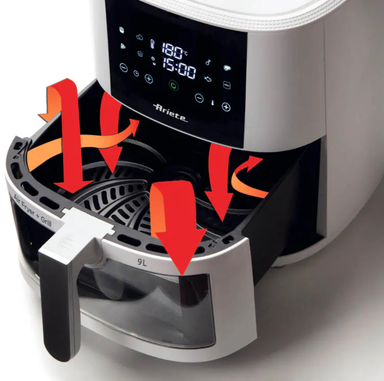 Фритюрниця готує завдяки повітрю високої температури, до 200 °C, яке циркулює з максимальною швидкістю 360° всередині камери приготування і забезпечує рівномірний розподіл тепла в її внутрішній частині. Саме гаряче повітря дозволяє однорідно готувати страви та отримувати хрустку скоринку, яка нічим не поступається традиційній фритюрниці. Завдяки гарячому повітрю не потрібно додавати багато олії, щоб отримати смачну смажену їжу, достатньо лише однієї столової ложки; таким чином ви подасте на стіл легші, але смачні страви для всієї родини.