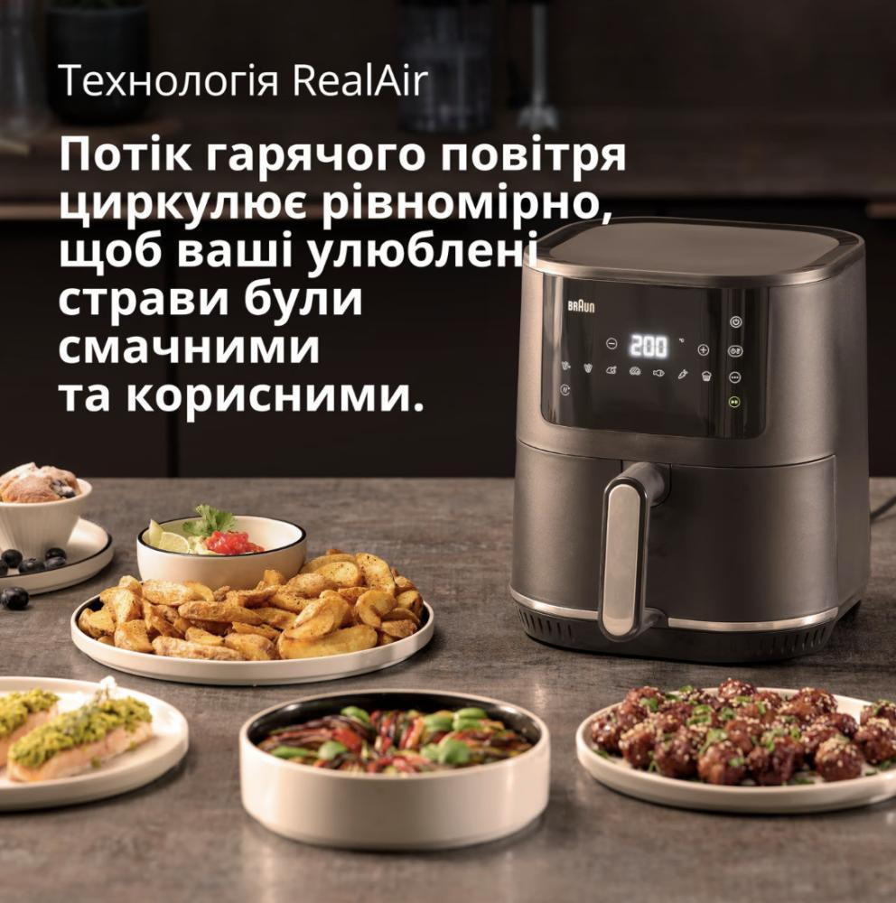 Мультипіч BRAUN HF 3030 BK з технологією RealAir. Надзвичайно гаряче повітря циркулює навколо вашої їжі, щоб отримати хрумкі продукти, які все ще залишаються ніжними всередині – з меншим додаванням олії на 90%, порівняно з приготуванням картоплі у звичайній фритюрниці.