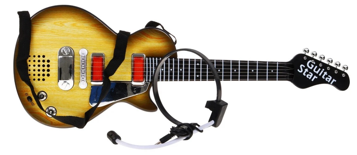 Електрична гітара з мікрофоном для дітей від 3 років. Красива та якісна електрична рок-гітара укомплектована навушниками з мікрофоном. Вона чудово імітує справжній інструмент, зі зручним ременем на плече і навушниками з мікрофоном, які під'єднуються до інструменту.