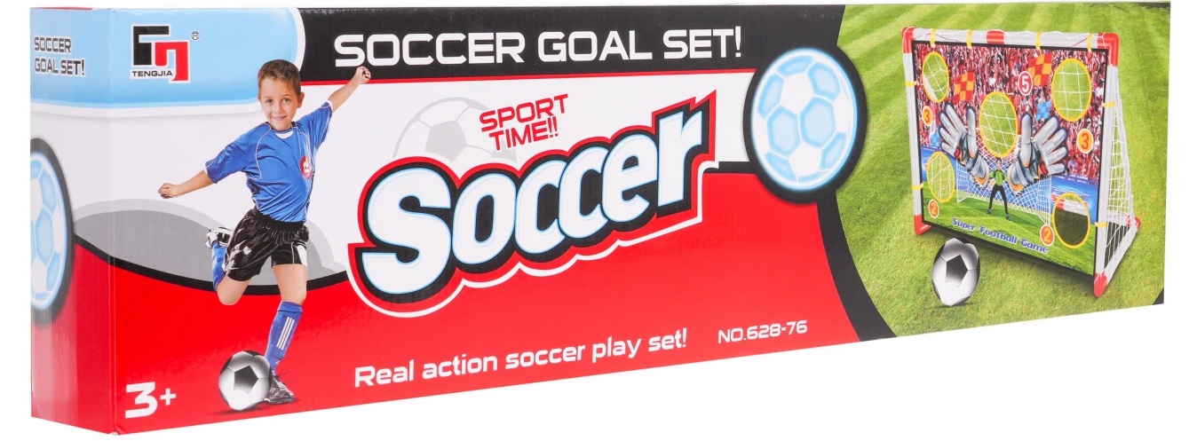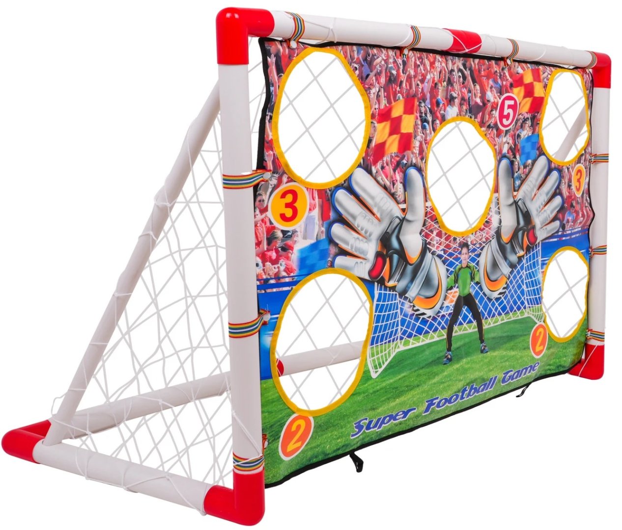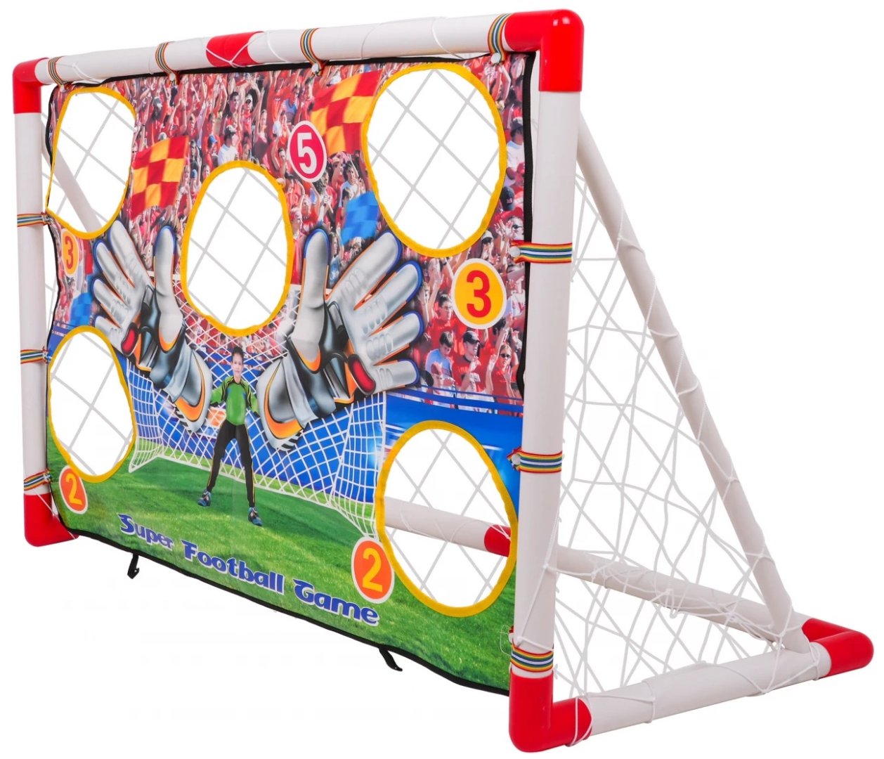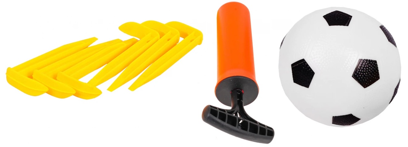 Ворота розміром 116 x 76 x 48 см оснащені міцною сіткою та килимком з отворами для тренування влучності. У комплекті також є м'яч діаметром приблизно 15 см, насос для його надування та кріпильні гаки, які стабілізують ворота під час гри на вулиці.