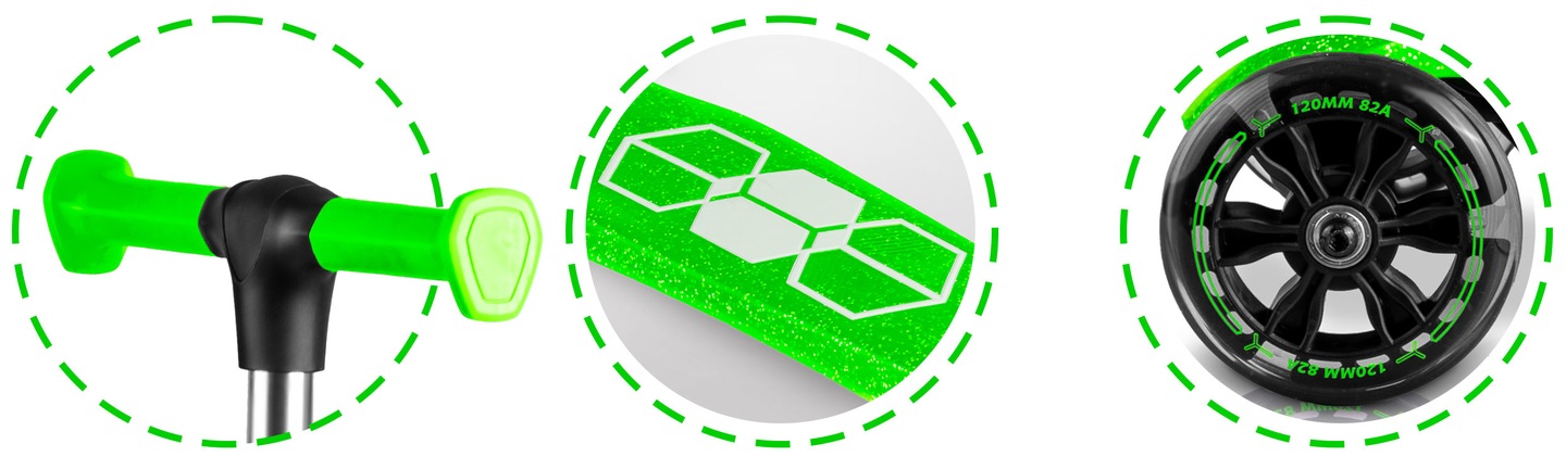 Триколісний дитячий самокат Ricokids Jelly. Сховані в платформі самоката світлодіодні панелі та світлові колеса додадуть трохи магії до звичайної гри. Керування здійснюється виключно за допомогою балансування тіла, без повороту керма. Достатньо злегка нахилитися в потрібну сторону і все. Дитина швидко освоює цю техніку їзди, а заодно тренує своє почуття рівноваги. Самокат, повертаючи, стабільно тримається у вертикальному положенні завдяки трьом колесам.