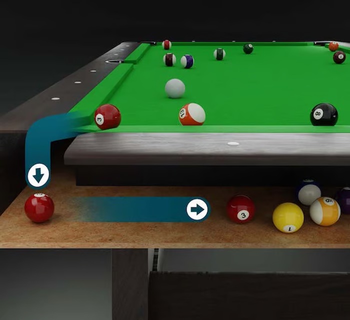 Завдяки застосуванню цієї системи кулі збираються під столом в одному місці. Більярдні лузи виготовлені з твердої гуми, а контейнер для куль оббитий пінопластом, який приглушує звуки.