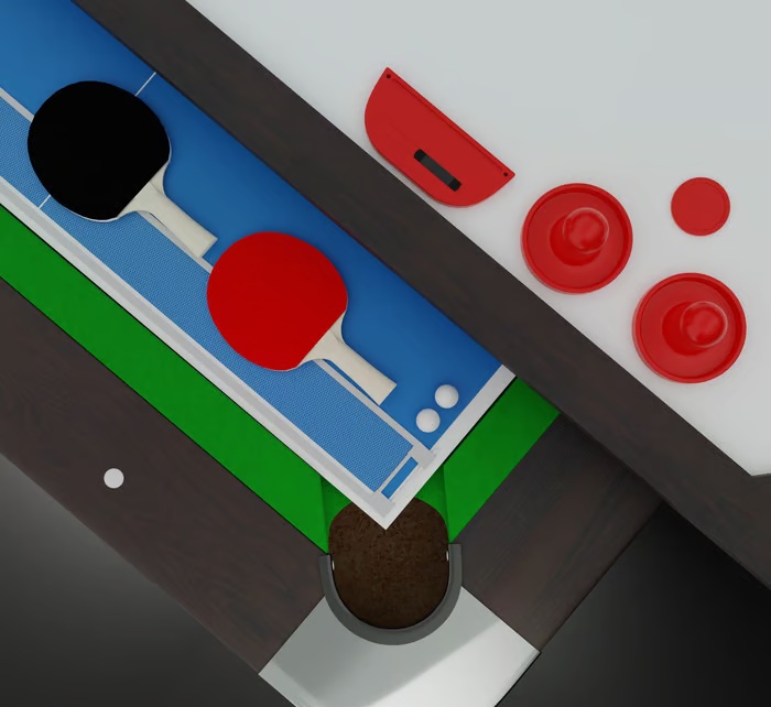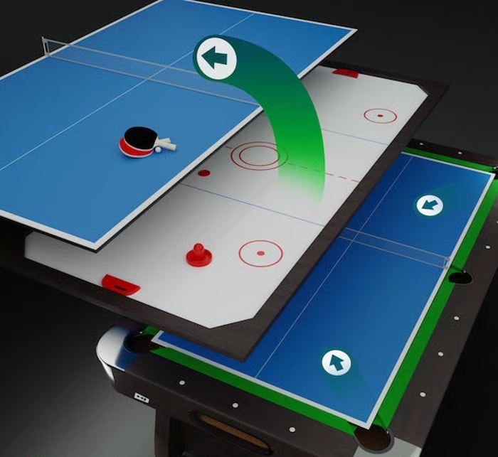 Двостороння накладка на більярдний стіл, завдяки якій ви швидко перетворите його на стіл для гри в пінг-понг або аерохокей. Накладку потрібно розмістити між бортами столу, а вам залишається тільки вибрати гру.