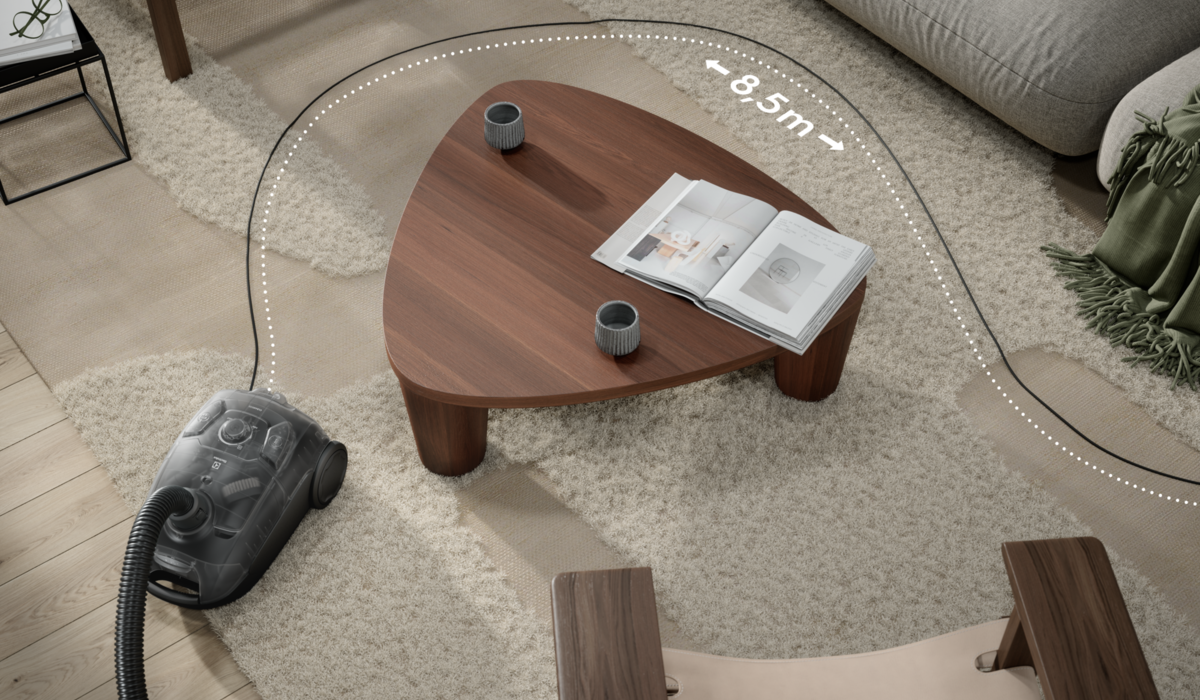 Ефективний та простий у використанні пилосос спрощує процес збирання. Завдяки новій насадці AllFloor і потужному всмоктуванню ви можете легко видаляти пил і бруд з твердих підлог і килимів. А змінити її режим можна одним рухом. Ергономічний пилосос дозволяє очищати поверхні площею до 72 квадратних метрів без підключення до розетки. Завдяки телескопічній трубці, великим колесам та радіусу очищення 8.5 метрів, ви можете легко пересуватися та робити прибирання без затримок.