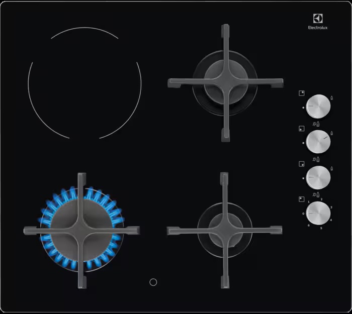 Варильна поверхня Electrolux EGE6182NOK поєднує газові конфорки та електричні зони нагрівання, забезпечуючи універсальність у приготуванні страв. Такий формат дозволяє обирати оптимальний тип нагріву залежно від рецепта та посуду.