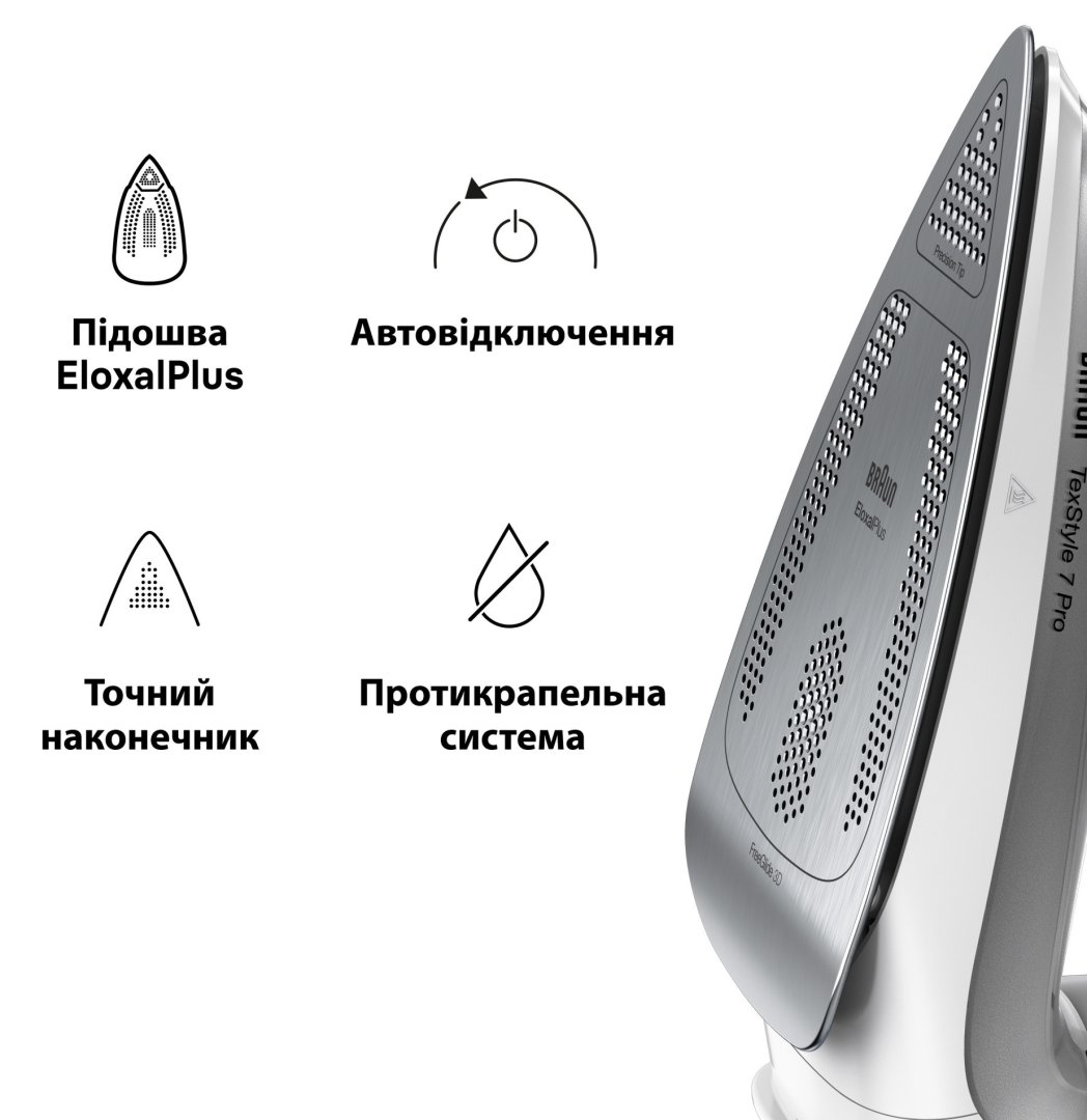 Особливість праски Braun SI 7149 полягає в особливій побудові підошви під назвою Back Glide. Завдяки чому ковзання під час прасування відбувається однаково ефективно у всіх напрямках, виключаючи появу складок при зворотному ході праски. Потужність 2900 Вт. Паровий удар 220 г/хв. Технологія підошви Eloxal Plus 3D FreeGlide.