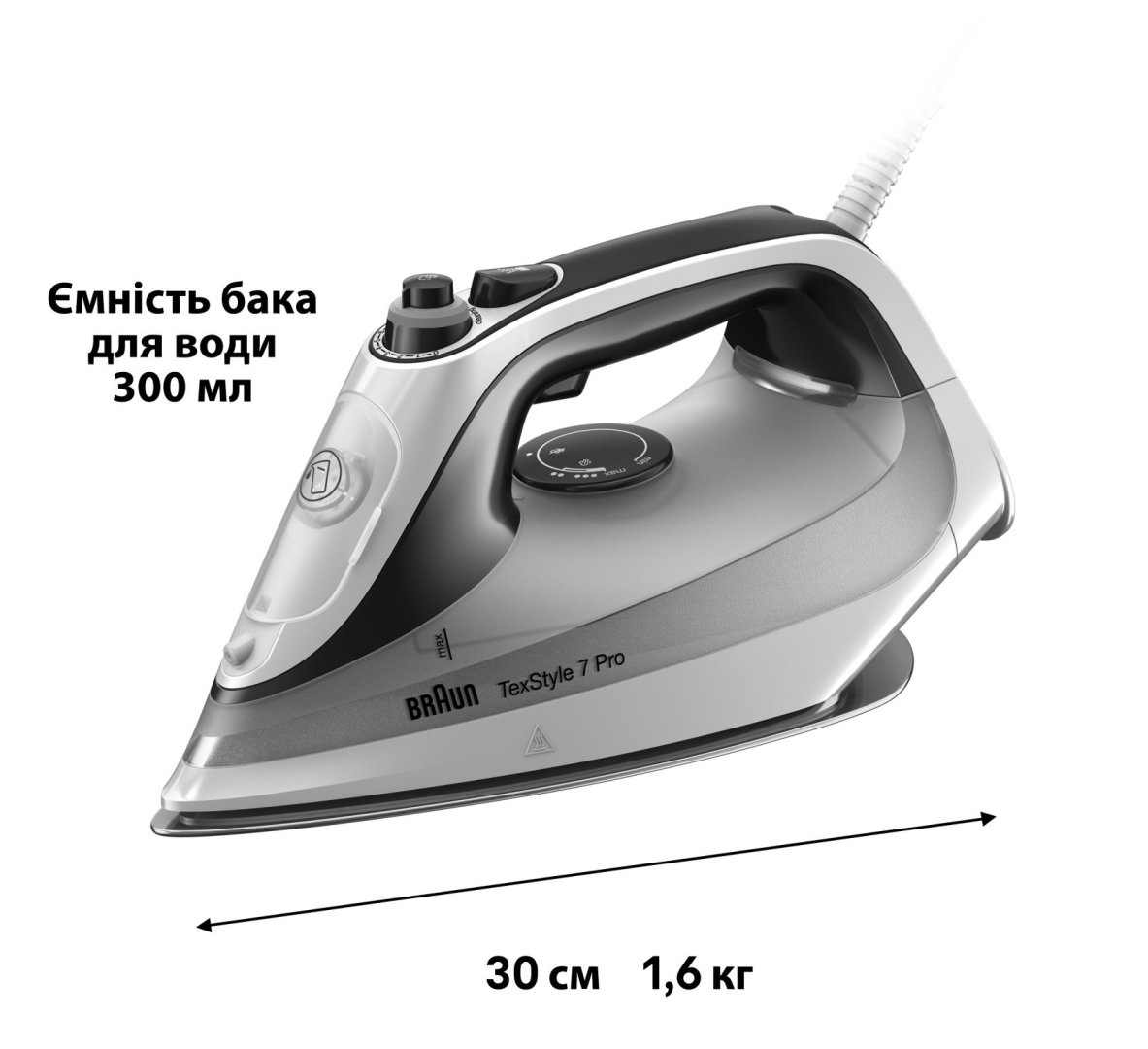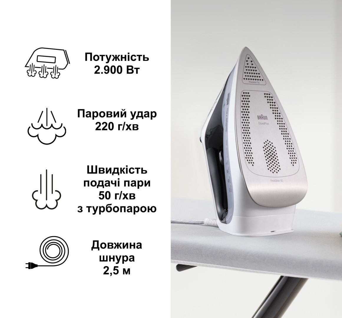 Потужність нагрівача для хорошої побутової праски, мабуть, найважливіший показник працездатності. І у Braun SI 7149 WB з потужністю все просто чудово. Одразу 2900 Ватт здатні перетворити на пару 300 мл. води у резервуарі за лічені хвилини. А це означає, що праска приводиться в робоче положення дуже швидко, вам не доведеться чекати розігріву, особливо, коли час підтискає і, наприклад, терміново потрібно розгладити щойно помічену складку.
