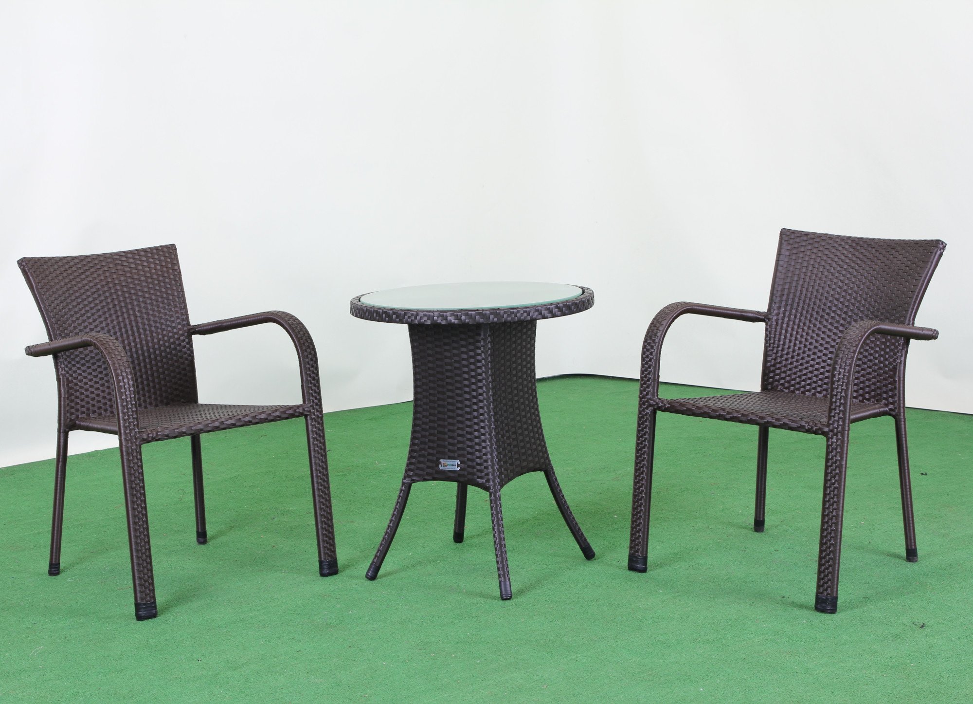 Комплект садових меблів Greengard Терра - стильне та сучасне рішення для облаштування затишного балкона чи невеликої зони відпочинку. Набір складається зі столу та двох стільців із підлокітниками. Штучний ротанг забезпечує легкість та привабливий вигляд, а скляна стільниця додає елегантності та практичності. Металевий каркас гарантує надійність конструкцій і стійкість до щоденного використання. За індивідуальним замовленням комплект можна доукомплектувати м’якими подушками.
