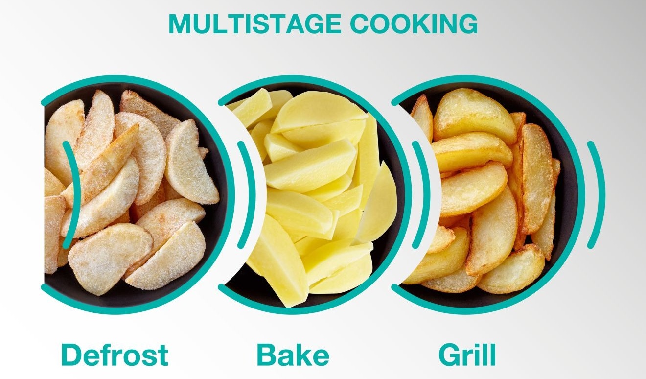 Готувати страви, які потребують двох або більше способів обробки, легко. Ви можете готувати в кілька етапів, вручну запрограмувавши етапи процесу приготування. Ви можете попередньо налаштувати, наприклад, розморожування протягом 10 хвилин, приготування за допомогою мікрохвиль, а потім гриль для ідеальної скоринки. Мікрохвильова піч автоматично виконає встановлені етапи, а ви отримаєте смачну страву.