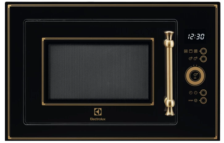 Мікрохвильова піч Electrolux EMT25203OK у вишуканому оформленні під старовину із золотистими деталями на чорному тлі стане справжньою окрасою кухні. Суворі лінії корпусу підкреслені контрастним декором, ручка, що відкриває дверцята, має незвичайну витончену форму. Ця модель органічно впишеться в інтер'єр, виконаний у класичному стилі. Сенсорна панель управління гармонійно поєднується із загальним дизайном та інтуїтивно зрозуміла в роботі. Така панель керування має зрозумілі символьні позначення, які допоможуть швидко розібратися в налаштуваннях. Таймер можна встановити до 95 хвилин. Зазначені параметри та час, що залишився до готовності страви, відображаються на дисплеї. Сім'ї з дітьми оцінять можливість блокування клавіш.