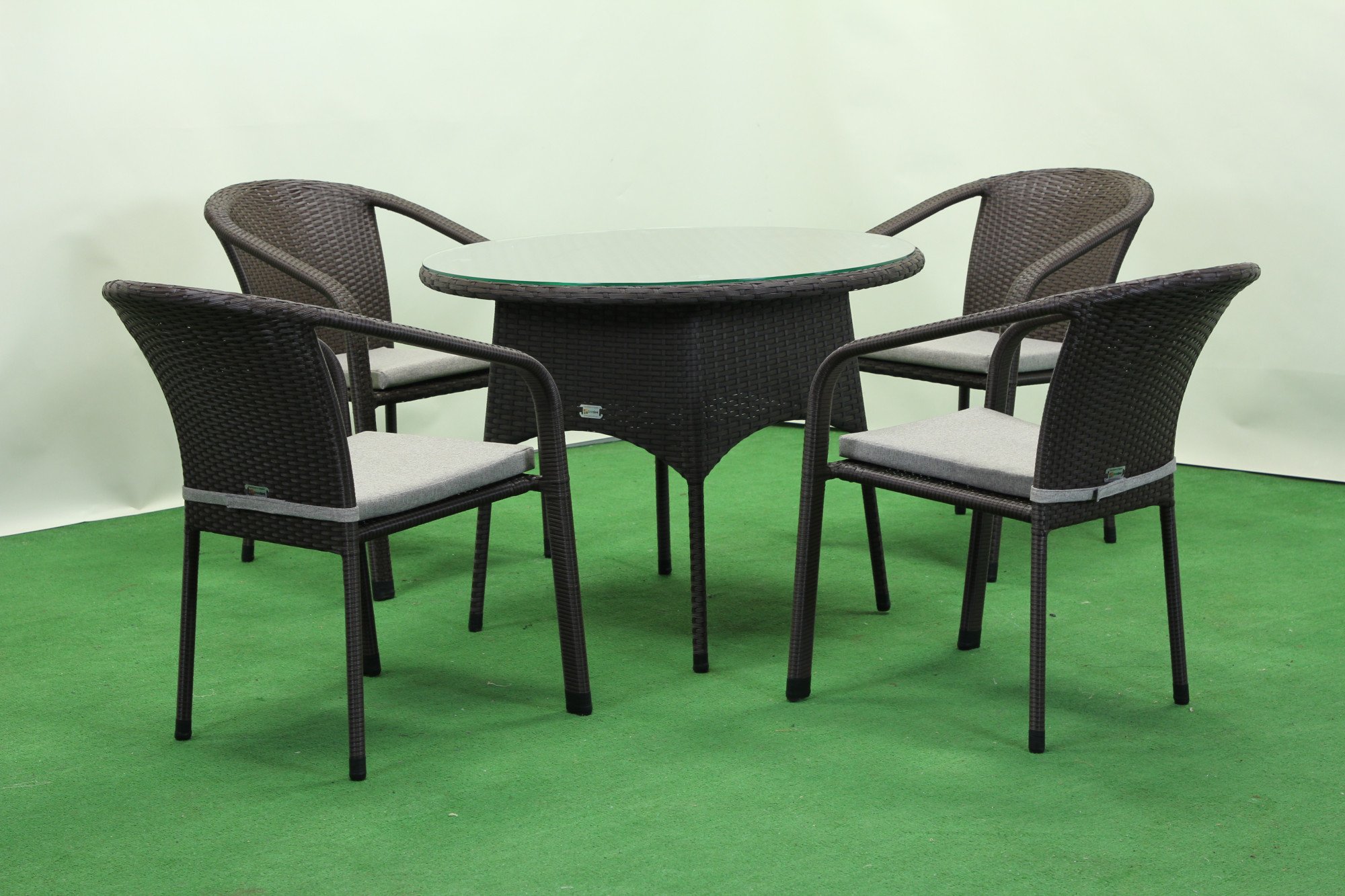 Комплект садових меблів Greengard Балеар Лайт — стильне та практичне рішення для облаштування зони відпочинку на терасі чи у саду. Набір складається зі столу та чотирьох стільців із підлокітниками, виконаних із штучного ротанга. Скляна стільниця додає сучасності та легкості, а металевий каркас із полімерним покриттям забезпечує міцність і довговічність. Ергономічна форма сидінь створює комфортні умови для відпочинку. Подушки не входять до вартості комплекту.
