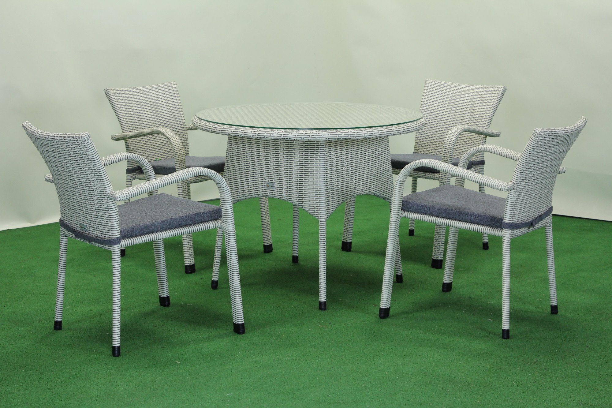 Комплект садових меблів Greengard Балеар Лайт — стильне та практичне рішення для облаштування зони відпочинку на терасі чи у саду. Набір складається зі столу та чотирьох стільців із підлокітниками, виконаних із штучного ротанга. Скляна стільниця додає сучасності та легкості, а металевий каркас із полімерним покриттям забезпечує міцність і довговічність. Ергономічна форма сидінь створює комфортні умови для відпочинку. Подушки не входять до вартості комплекту.