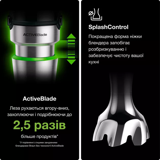 Безумовним плюсом приладу є простота і швидкість зміни насадок. Вони від’єднуються від моторного блоку одним легким рухом та надійно фіксуються спеціальним замком на весь час роботи. Нога виготовлена з міцного легкого металу за технологією PowerBell Plus та системою SplashControl. Розширення у вигляді невеликого «дзвону» в нижній частині запобігає розліту частинок продуктів, коли ви обробляєте інгредієнти у відкритому посуді. Посилені рухливі ножі ActiveBlade, здійснюють вертикальні рухи, на 40% знижуючи необхідні зусилля, які вам потрібно прикладати під час обробки.