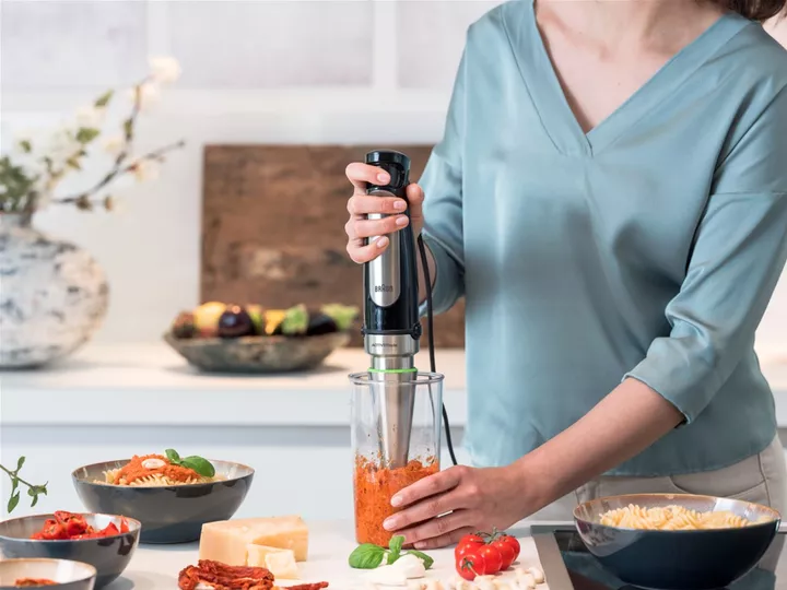 Для перемішування, подрібнення, збивання інгредієнтів можна використовувати найрізноманітніші побутові прилади або навіть змішувати все вручну. А можна просто купити занурюваний блендер Braun MQ 7045 X, який здатен повноцінно виконувати роботу міксера і, часом, виявляється більш зручним в роботі, ніж потужний кухонний комбайн. Секрет простий і полягає в комплектації: металевий широкий вінчик та два універсальних подрібнювачі (1.25 і 0.35 л) на додаток до стандартної фірмової блендерної ніжки з технологією ActiveBlade.