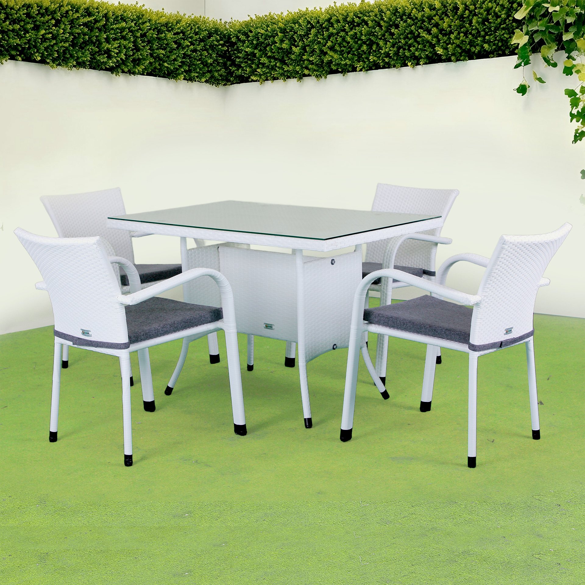 Комплект садових меблів Greengard Комфорт 100 — стильне та функціональне рішення для облаштування зони відпочинку на терасі, в альтанці чи саду. Завдяки універсальному дизайну гармонійно доповнює інтер’єр обідньої зони у квартирі або будинку. Штучний ротанг безпечний у використанні, не має запаху та не викликає алергії, а скляна стільниця, посилена німецькою плівкою d-c-fix, вирізняється міцністю та елегантним матовим відтінком. Стіл можна розібрати при необхідності, а стільці з підлокітниками забезпечують комфорт під час відпочинку. Можлива комплектація подушками.
