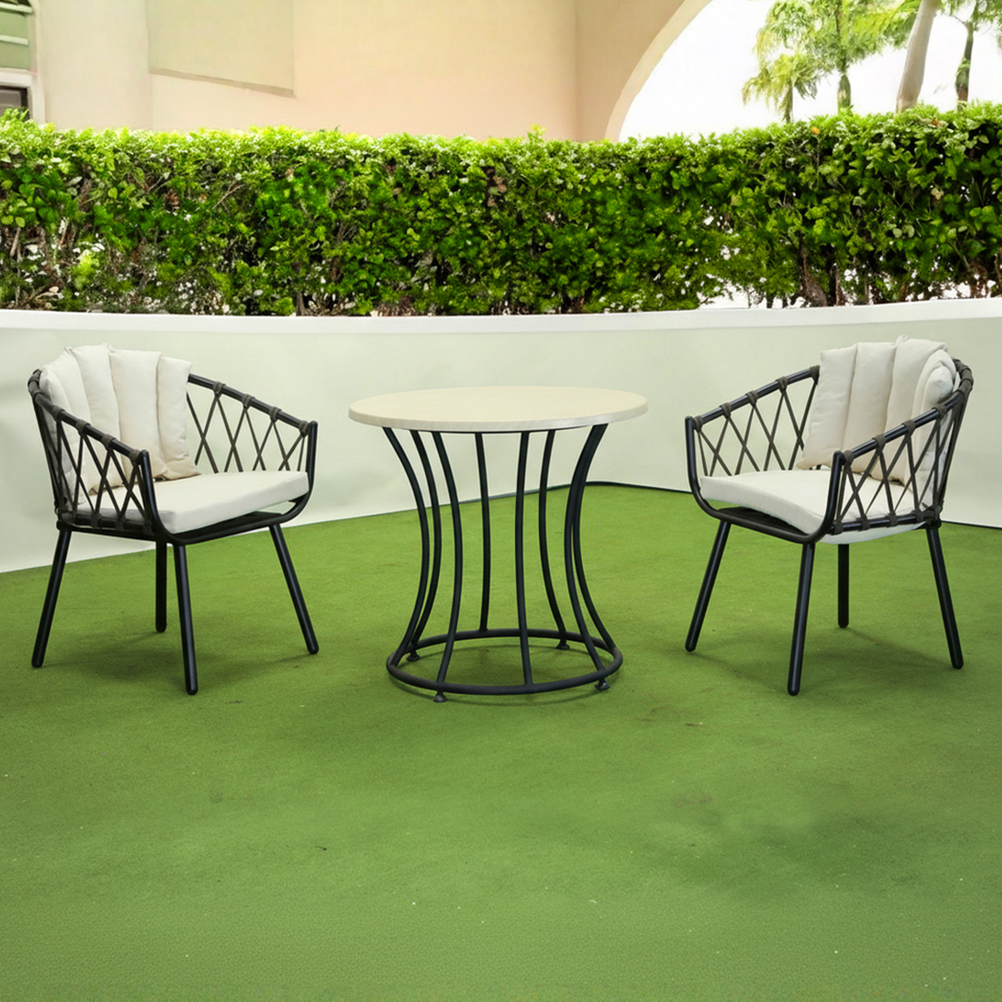 Комплект садових меблів Greengard Рів’єра 2— елегантне та сучасне рішення для облаштування затишної зони відпочинку на терасі чи в саду. Набір складається з двох комфортних крісел із м’якими подушками та оригінальним плетінням, а також стильного круглого столу зі стільницею з верзоліту, що імітує дерево. Завдяки поєднанню металевого каркаса з порошковим фарбуванням меблі вирізняються високою стійкістю до корозії та зовнішніх впливів, зберігаючи естетичний вигляд протягом багатьох років.