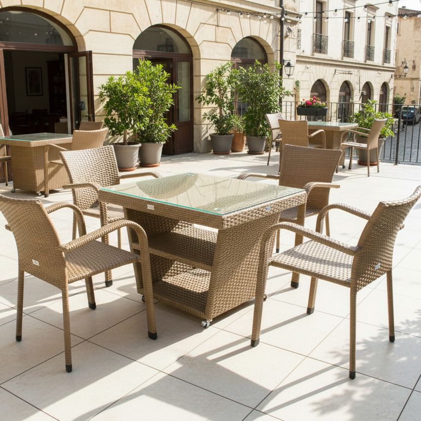 Комплект садових меблів Greengard Чікаго — стильне та практичне рішення для облаштування зони відпочинку на терасі, в альтанці чи саду. Витончений дизайн поєднує комфорт і функціональність, створюючи затишну атмосферу для обідів та зустрічей. Міцний металевий каркас із полімерним покриттям забезпечує довговічність, а плетіння зі штучного ротанга вирізняється стійкістю до зовнішніх впливів та легкістю у догляді. Скляна стільниця додає елегантності та сучасного вигляду.