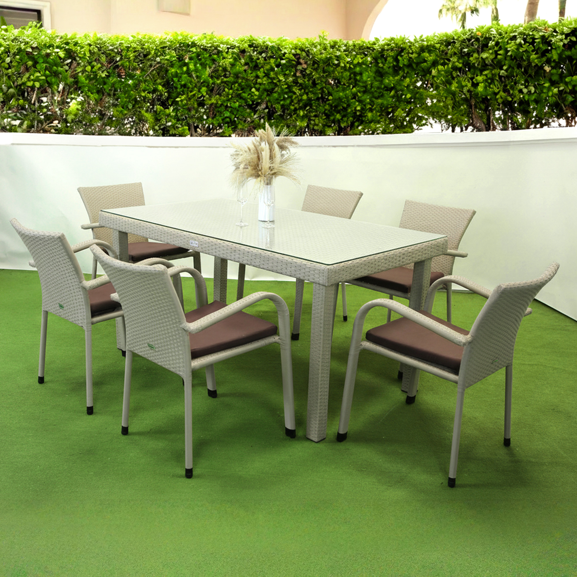 Комплект садових меблів Greengard Вермонт 180— елегантне та практичне рішення для облаштування зони відпочинку. Сучасний дизайн поєднує комфорт і функціональність, створюючи затишну атмосферу для сімейних обідів чи зустрічей на терасі, в альтанці або саду. Міцний металевий каркас із полімерним покриттям забезпечує надійність конструкції, а плетіння зі штучного ротанга вирізняється стійкістю до зовнішніх впливів та легкістю у догляді. Скляна стільниця додає комплекту витонченості та сучасного вигляду.