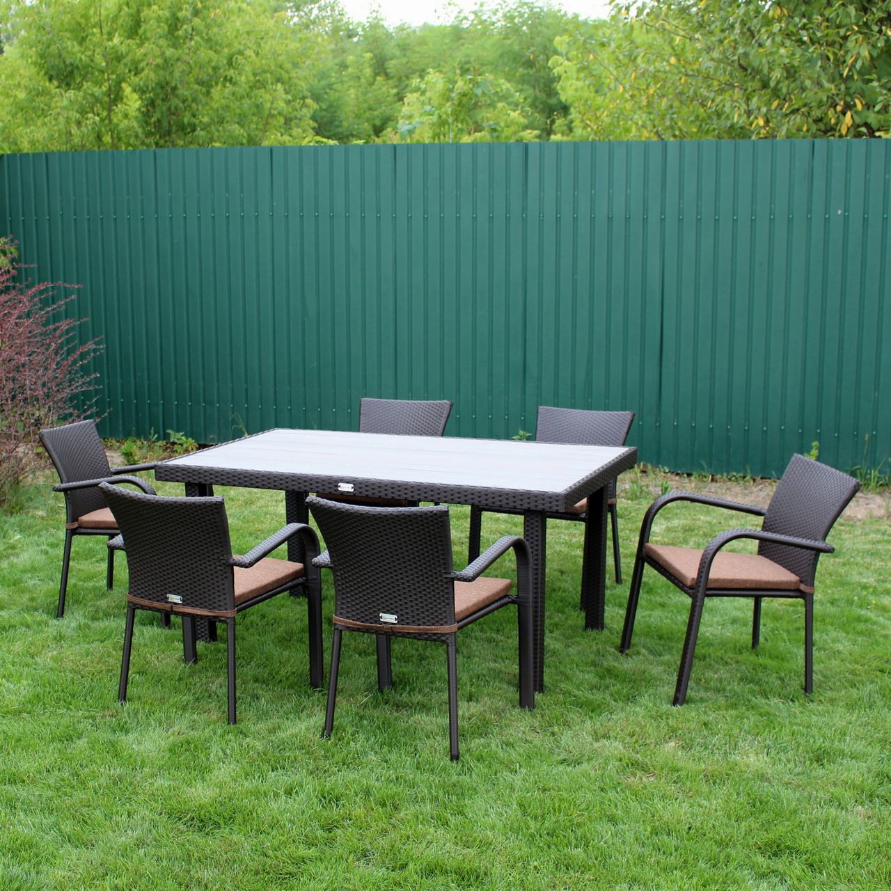 Комплект садових меблів Greengard Верона 160 — стильне та практичне рішення для облаштування зони відпочинку. Сучасний дизайн поєднує комфорт і функціональність, створюючи затишну атмосферу для обідів та зустрічей на терасі, в альтанці чи саду. Міцний металевий каркас із полімерним покриттям забезпечує надійність, а плетіння зі штучного ротанга вирізняється стійкістю до зовнішніх впливів та легкістю у догляді. Композитна стільниця додає комплекту сучасного вигляду та практичності.