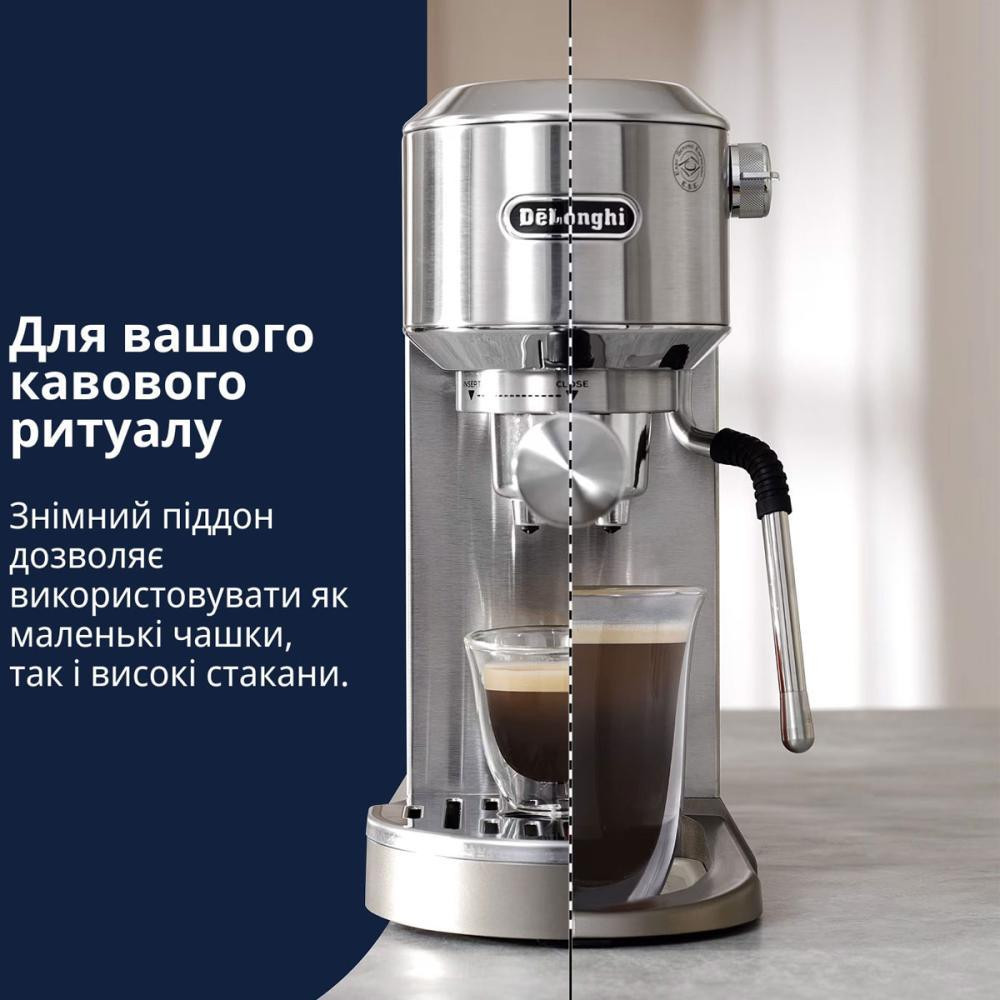 Регульована висота піддонів дозволяє використовувати склянки різної висоти. Варити каву можна як в улюбленій чашці, так і в елегантному кавовому стакані для латте макіато. Ємність резервуара для води Delonghi становить 1.1 л.