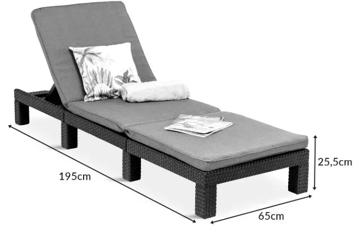 Комфортний і елегантний лежак KETER Daytona Deluxe з м'якими сірими подушками та регульованою спинкою. Зручні м'які подушки додадуть ще більше комфорту. Модель DAYTONA відрізняється високою міцністю і стійкістю до пошкоджень, а також до несприятливих впливів вологи і УФ-променів. Для чищення достатньо теплої води з додаванням миючих засобів і м'якї ганчірки.