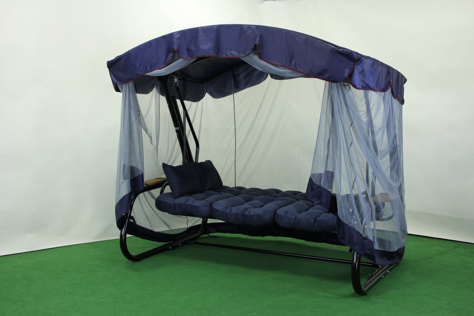 У спекотні дні тент забезпечує захист від сонця, а москітна сітка огортає каркас по всій площі, захищаючи від комах. За потреби сітку можна відстебнути або підв’язати під козирком. Спинка регулюється за нахилом і може повністю розкладатися у горизонтальне положення, перетворюючи гойдалку на просторе літнє ліжко з фіксацією від розгойдування.