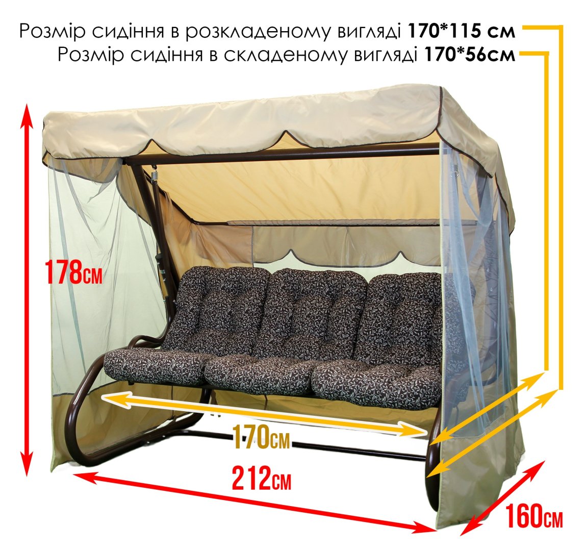 Міцна конструкція витримує навантаження до 400 кг, що дозволяє комфортно розмістити трьох дорослих осіб. Спинка регулюється та може розкладатися у горизонтальне положення, перетворюючи гойдалку на зручне літнє ліжко з фіксацією від розгойдування.