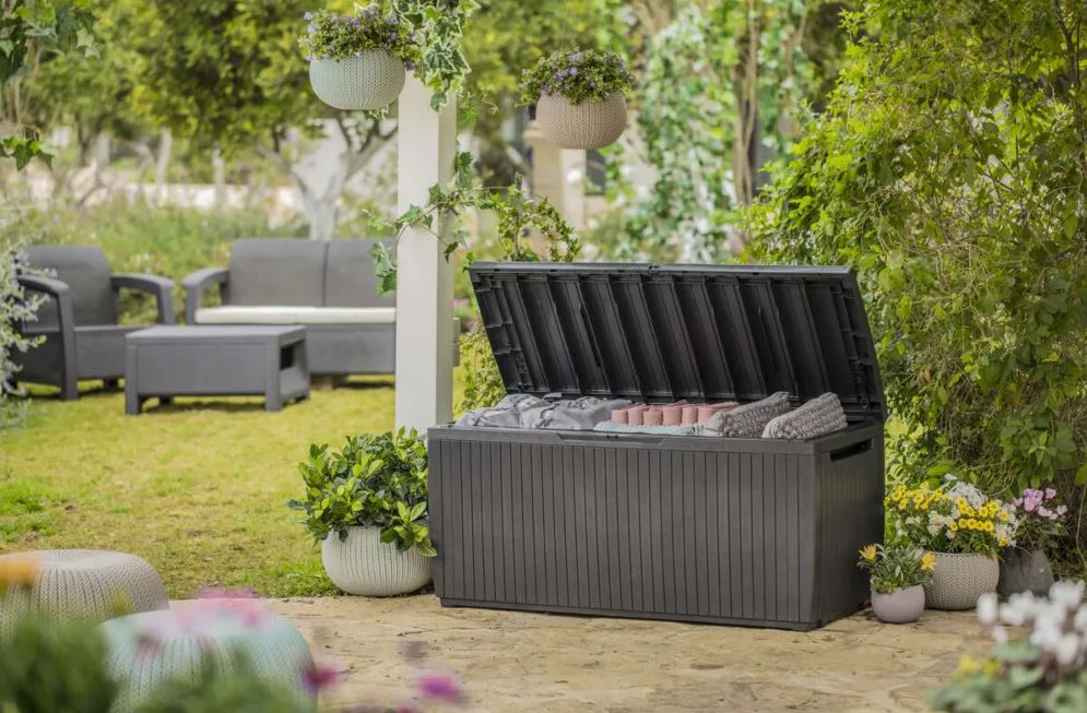 Завдяки своїм розмірам, він достатньо просторий, щоб розмістити садовий інвентар, невеликі садові меблі, такі як складні стільці, або різні види садового приладдя. Крім того, скриня має функцію сидіння, що полегшує роботу в саду та забезпечує комфортний відпочинок під час перерв. Можна успішно використовувати на терасі чи балконі.