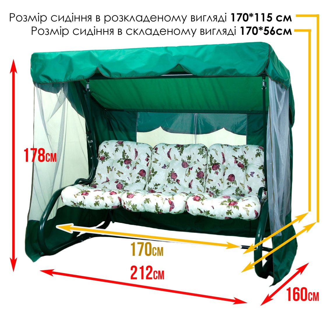 Сидіння має зварну металеву основу, а спинка може опускатися у горизонтальне положення, перетворюючи гойдалку на комфортне місце для відпочинку.