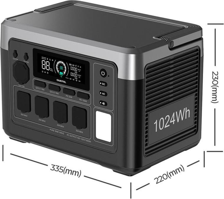 Oukitel P1000E Plus - портативна електростанція на акумуляторах LiFePO₄ ємністю 1024 Вт-год з інвертором чистої синусоїди 230 В і безперервною вихідною потужністю 1800 Вт (пікова до 3600 Вт) для живлення побутової електроніки та ІТ-обладнання. На панелі передбачено чотири розетки AC 230 В (EU), два порти USB-C Power Delivery (до 100 Вт і до 20 Вт) і два USB-A по 18 Вт; керування групами виходів та індикація вхідної/вихідної потужності реалізовані через фронтальний дисплей і кнопки, а також через мобільний застосунок із віддаленим контролем параметрів.