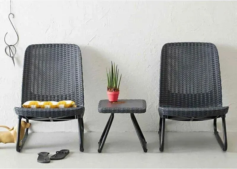 Набір садових меблів Keter Rio у графітовому кольорі — це компактний і стильний комплект, який чудово підійде для балкона, тераси чи зони відпочинку біля басейну. До складу входять два низькі, але зручні крісла та невеликий квадратний столик, ідеальний для кави чи коктейлів. Завдяки своїй формі та розмірам набір створює затишну атмосферу для відпочинку удвох.