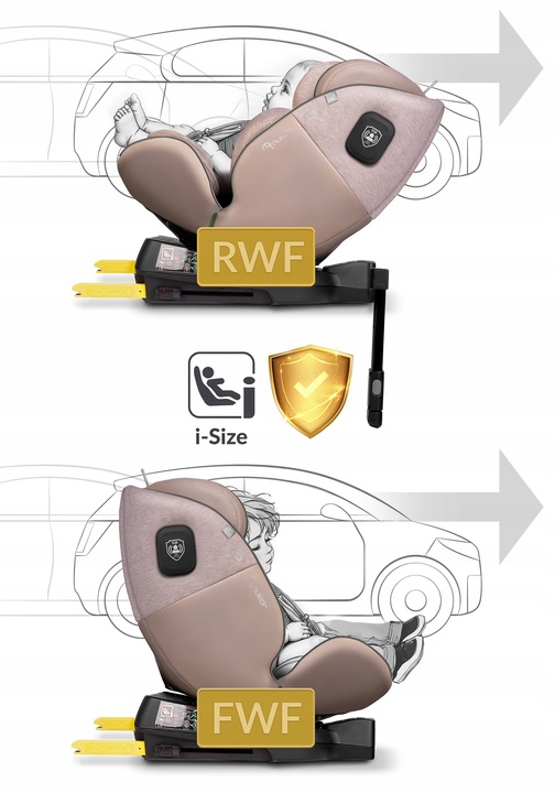 - встановлення в положенні спиною до напрямку руху (RWF) призначене для дітей зростом 40-105 см (відповідає віку від народження до приблизно 4 років),