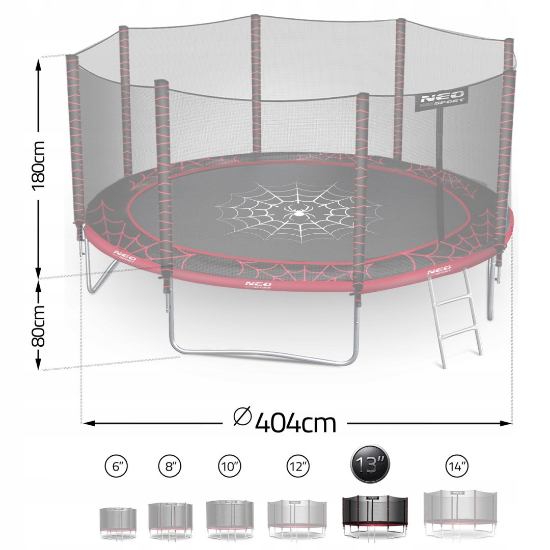 Батут Neo-Sport NS-13Z241 з зовнішньою сіткою 13 футів 404 см – це просторий садовий батут, створений для активного відпочинку та розваг на свіжому повітрі. Завдяки великій площі для стрибків він підходить як для дітей, так і для дорослих. Конструкція вирізняється міцністю та стабільністю, витримує навантаження до 150 кг і забезпечує високий рівень безпеки завдяки зовнішній захисній сітці, міцному каркасу та продуманим деталям.