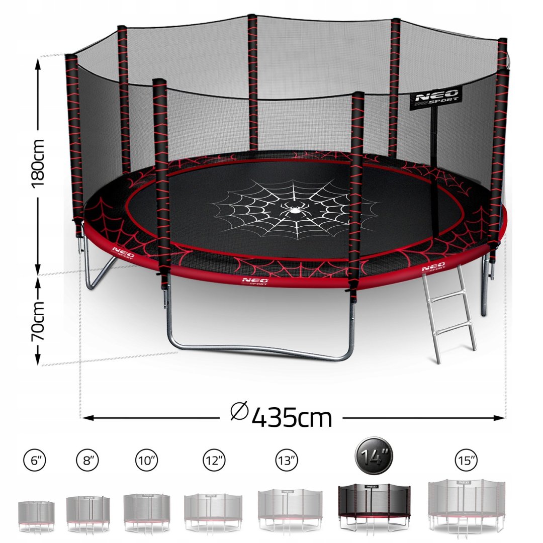 Батут Neo-Sport NS-14Z241 з зовнішньою сіткою 14 футів 435 см – це просторий садовий батут, створений для активного відпочинку та розваг на свіжому повітрі. Завдяки великій площі для стрибків він підходить як для дітей, так і для дорослих. Конструкція вирізняється міцністю та стабільністю, витримує навантаження до 150 кг і забезпечує високий рівень безпеки завдяки зовнішній захисній сітці, міцному каркасу та продуманим деталям.