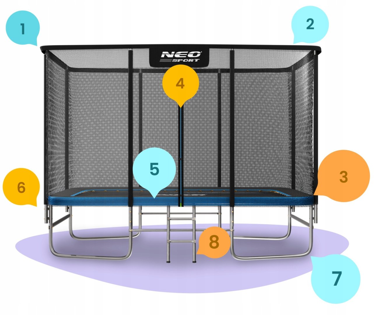 Велика поверхня для стрибків дарує більше руху, сміху та енергії. Матеріали стійкі до ультрафіолету та вологи, тому батут швидко висихає після дощу й готовий до використання. Neo-Sport 12x8 – це поєднання міцності, безпеки та комфорту, яке робить кожен день активним і веселим.