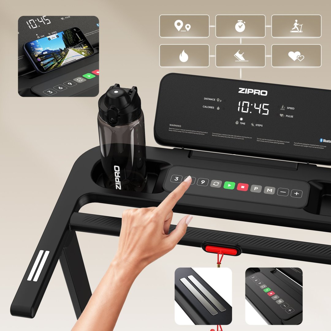ZIPRO Forma Lite оснащена простою у використанні панеллю керування з чітким LED-дисплеєм. Екран відображає ключові тренувальні дані у зрозумілій та наочній формі, що дозволяє зосередитися на вправах, а не на керуванні пристроєм. Кнопки швидкого вибору швидкості дозволяють миттєво змінювати темп без зупинки тренування, що підвищує комфорт використання навіть під час коротких щоденних сесій.