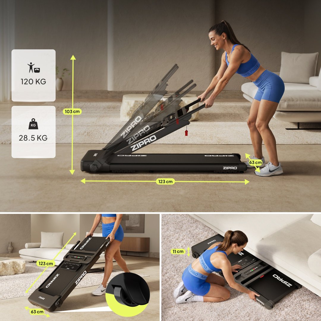 ZIPRO Forma Lite важить лише 29,5 кг, а завдяки транспортувальним коліщаткам дозволяє зручно переміщати та швидко прибирати після тренування. У складеному вигляді її висота становить лише 11 см, тому вона без проблем поміщається під ліжком, диваном або вздовж стіни, заощаджуючи місце та ідеально підходячи для невеликих приміщень.