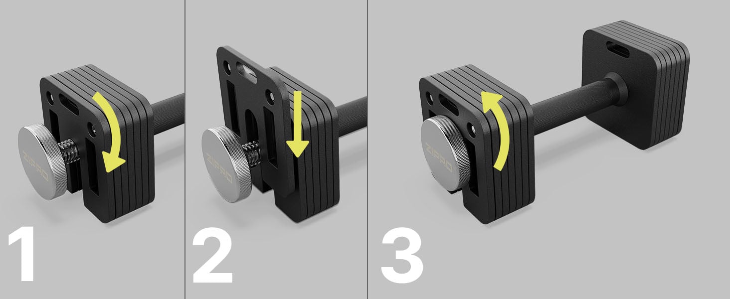 Переважна більшість гантелей на ринку вимагає копіткого відкручування затискного гвинта, а потім зсунення дисків з самої штанги. Це процес, який непотрібно затягується, і який був повністю усунутий у випадку гантелей ZIPRO. Достатньо злегка ослабити затискний гвинт двома-трьома рухами. Потім витягуємо або вставляємо диски – можна з легкістю вийняти навіть ті, що знаходяться всередині. Вся процедура відбувається під час підняття даного навантаження або вставляння нового. Наприкінці достатньо закрутити гвинт і все готово – диски жорстко закріплюються, а весь процес займає не більше 10 секунд.