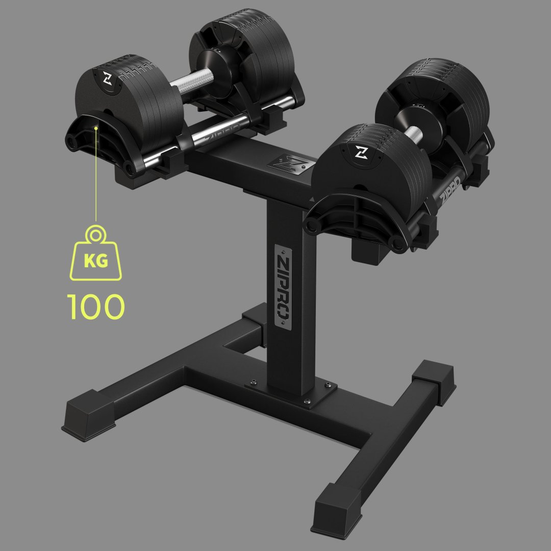 Стійка розроблена так, щоб вмістити два комплекти регульованих гантелей вагою до 36 кг або 24 кг кожен, що робить її надзвичайно практичною та універсальною.