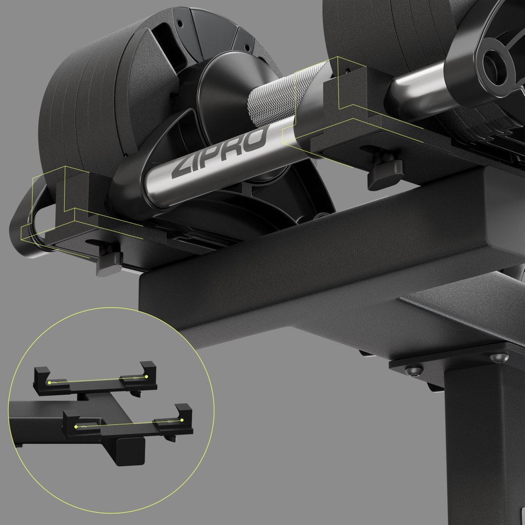 Регульовані кріплення дозволяють розміщувати регульовані гантелі ZIPRO Round вагою 24 кг та 36 кг