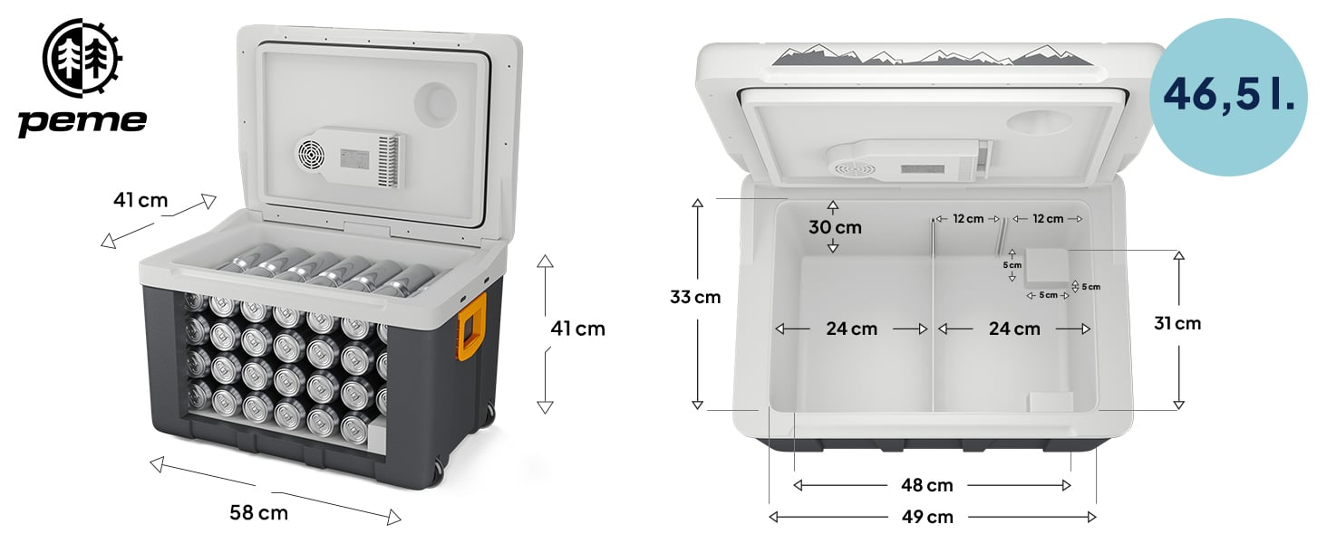 Модель Peme Essential XL 50 пропонує аж 49,8 літра місткості, що дозволяє зберігати значну кількість харчових продуктів. Попри свою місткість, пристрій зберігає компактні розміри: 600 × 390 × 420 мм, що робить його легким для перенесення та транспортування. Він чудово поміщається в багажник автомобіля і не займає багато місця на кемпінгу або в дачному будиночку. Завдяки цьому ви можете бути впевнені, що візьмете його з собою завжди, коли це буде необхідно.