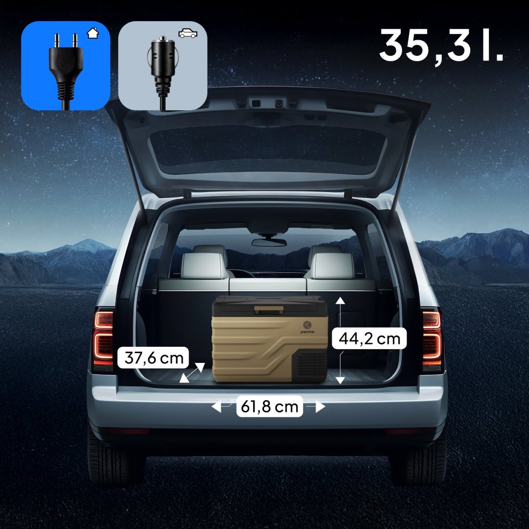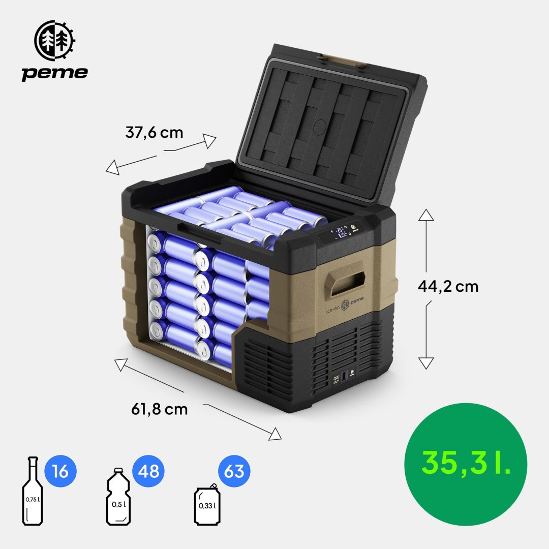 Автомобільний холодильник має об'єм 35,3 л, чого вистачить для запасів їжі та напоїв для кількох осіб. Його розмір та практично спроєктований внутрішнє приміщення дозволяють спакувати провізію навіть на кількаденну подорож. Завдяки цьому вам не доведеться турбуватися про те, чи є поблизу магазини. Все, що вам потрібно, ви зможете спакувати в портативний холодильник Peme Quest 40.